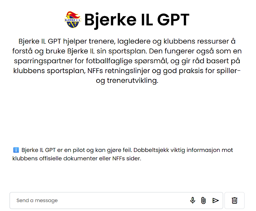 Bjerke IL GPT er en digital assistent som kjenner klubbens sportsplan, NFFs retningslinjer og god praksis innen spiller- og trenerutvikling. Verktøyet er laget for å gjøre informasjon lettere tilgjengelig og gi trenere en enkel måte å få faglig støtte på – enten man trenger raske svar eller ønsker sparring på fotballfaglige problemstillinger.
